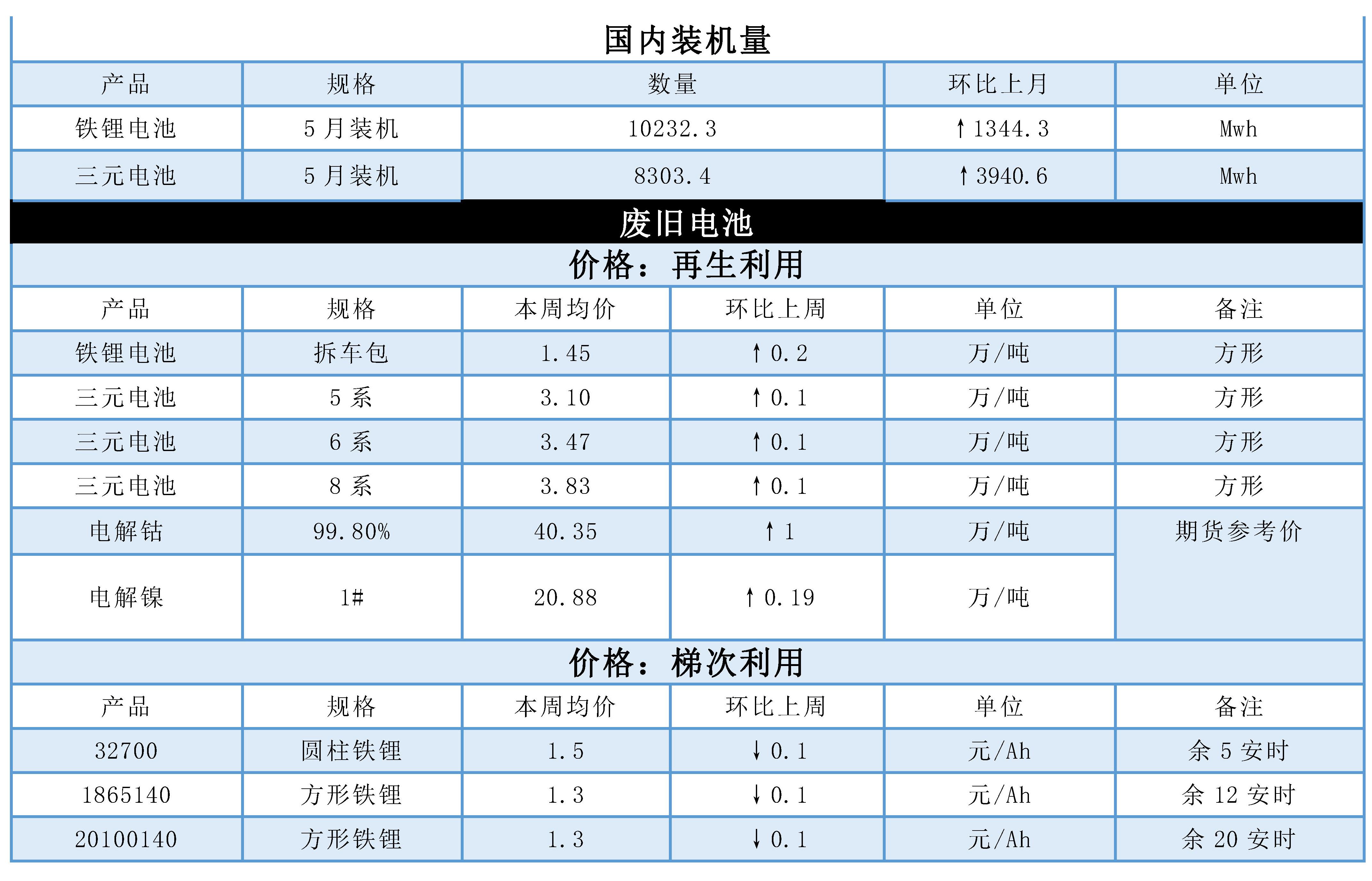 废旧电池价格高位回落较为明显,圆柱梯次电池从1.7元/安时跌至1.5元/安时,也反应了电池成本端的压力有所缓解,未来2-3个月进入梯次电池淡季,价格预计弱势为主。